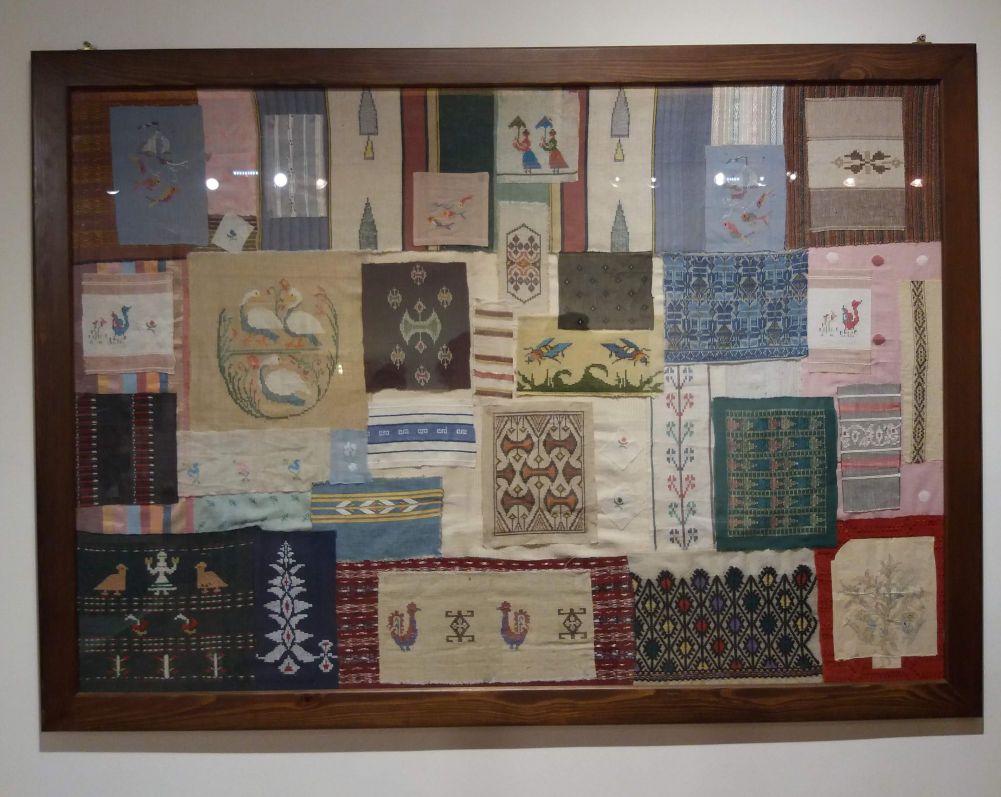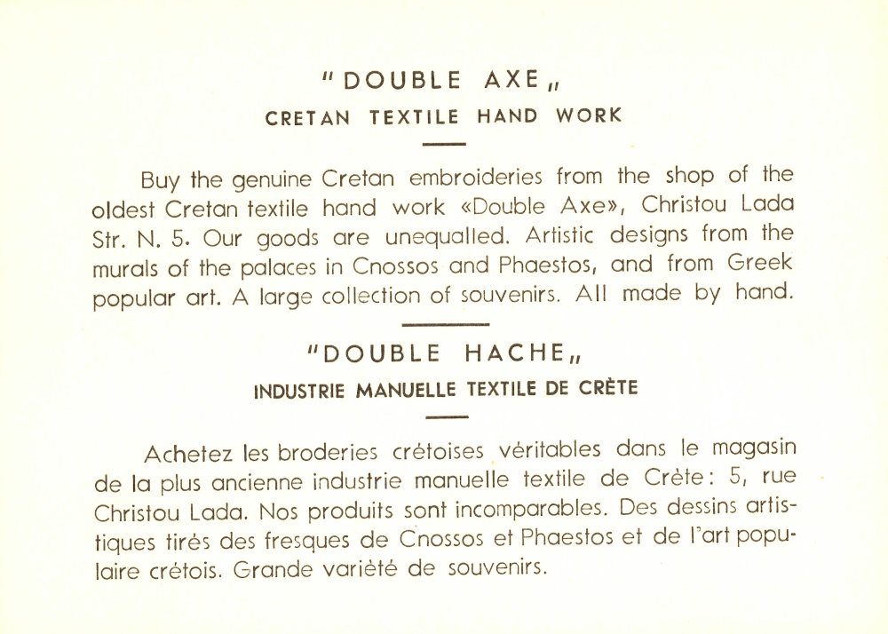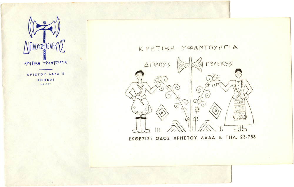 King Paul and queen Frederica visiting the Double Axe stand in the Athens 1949 folk art exhibition. Kaloutsi's daughter, Sissi, shows a tablecloth.