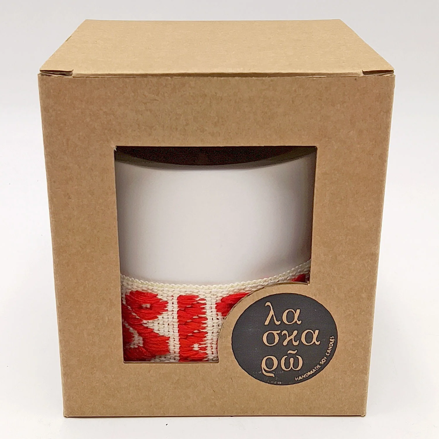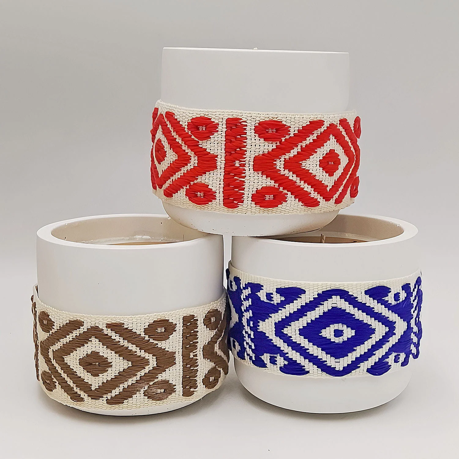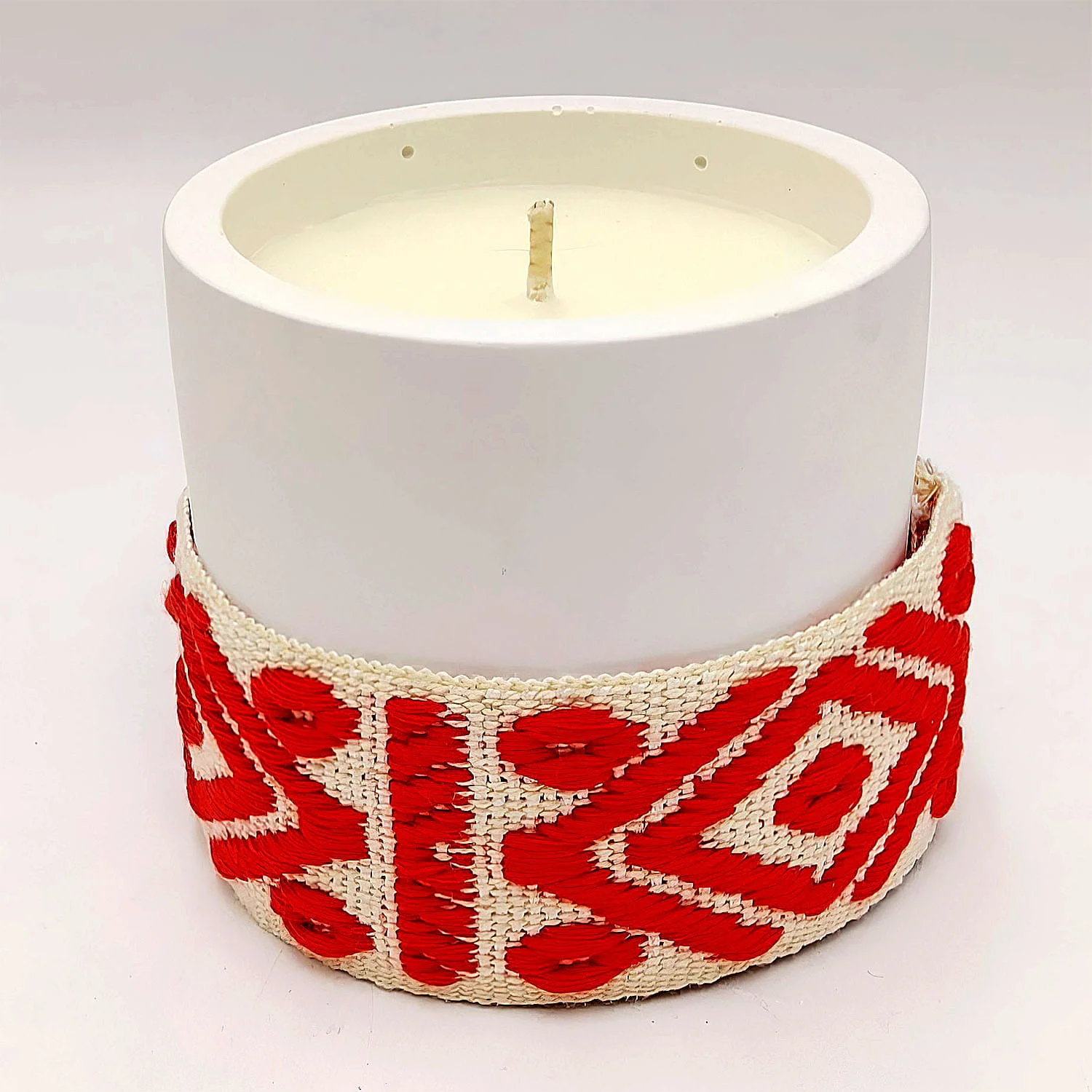 Α scented candle in a cylindrical ceramic container wrapped with a decorative woven band. Available in three colours.