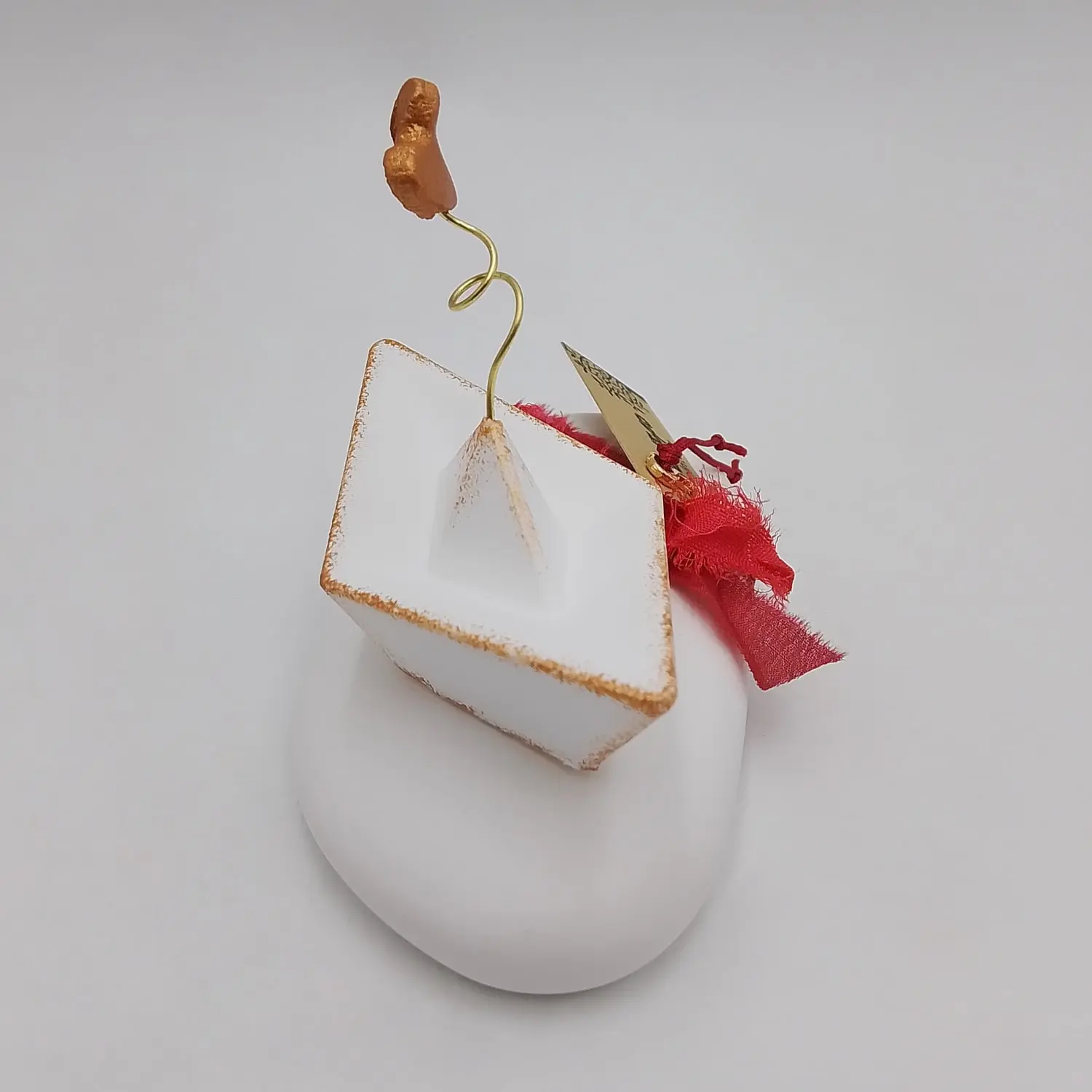 Handmade white ceramic boat fixed on a white pebble, decorated with a papier-mâché heart and red ribbons.