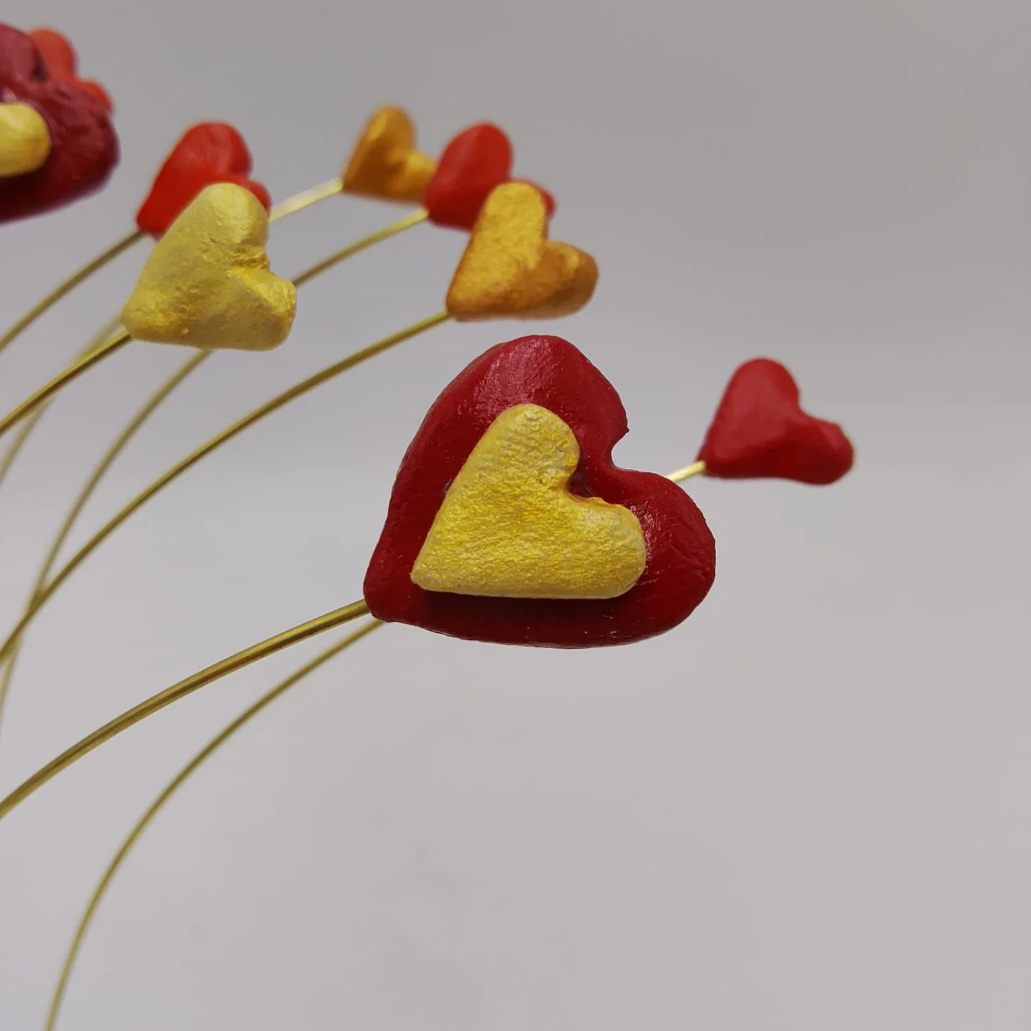 Handmade papier-mache hearts fixed on a round ceramic base.