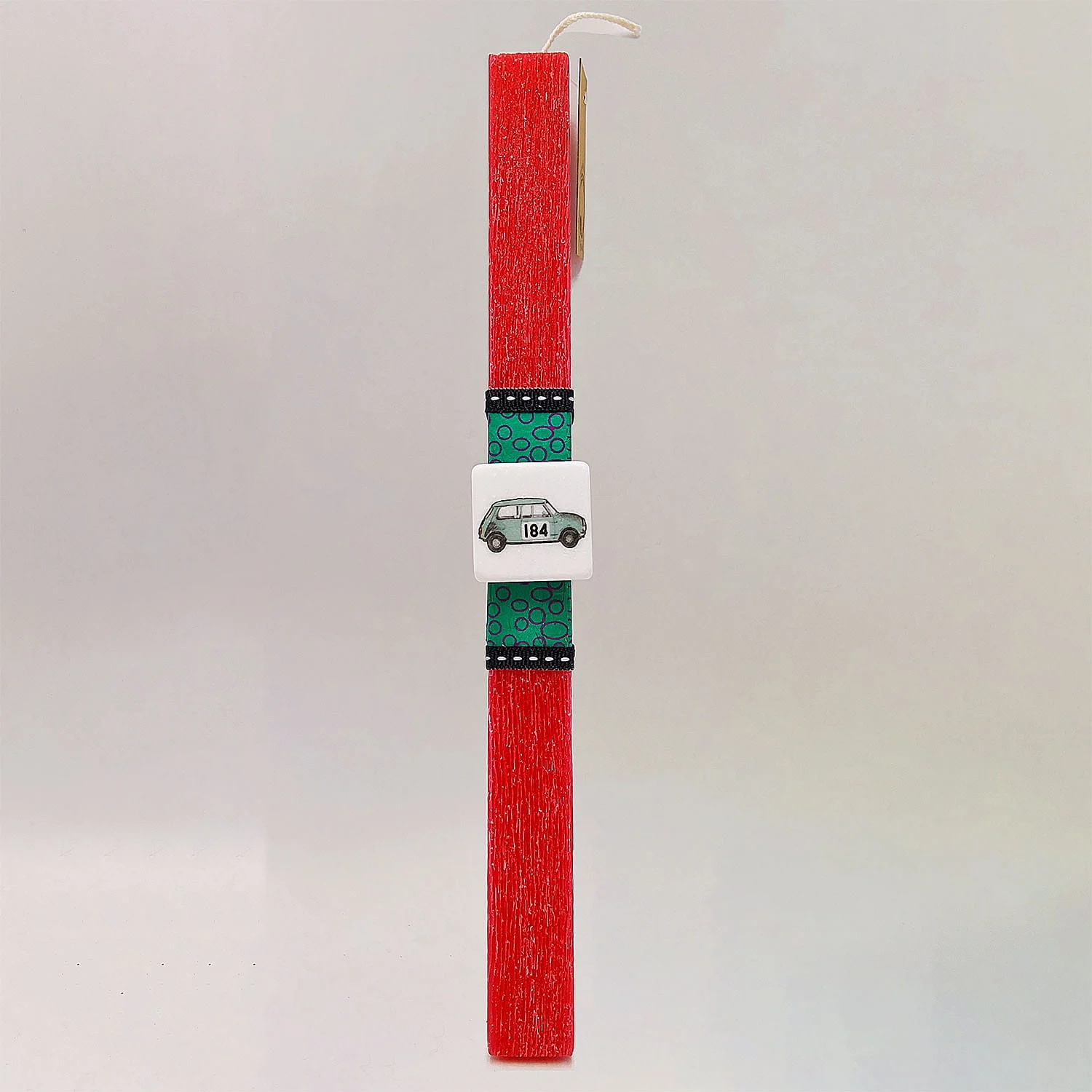 Κόκκινη τετράγωνη αρωματική λαμπάδα 25 εκ. από παραφίνη στολισμένη με κεραμικό μαγνητάκι.