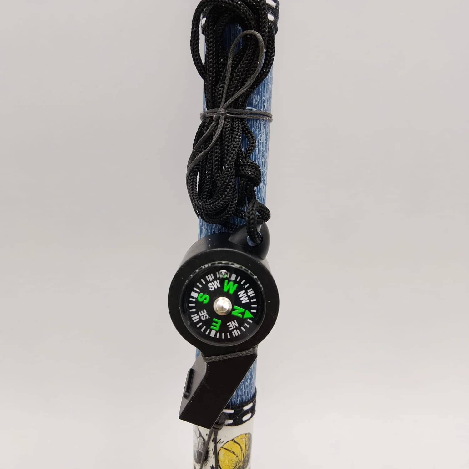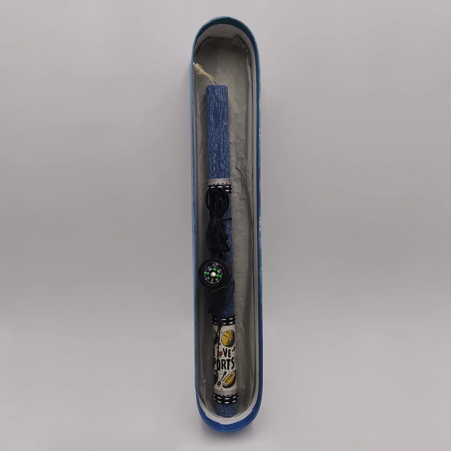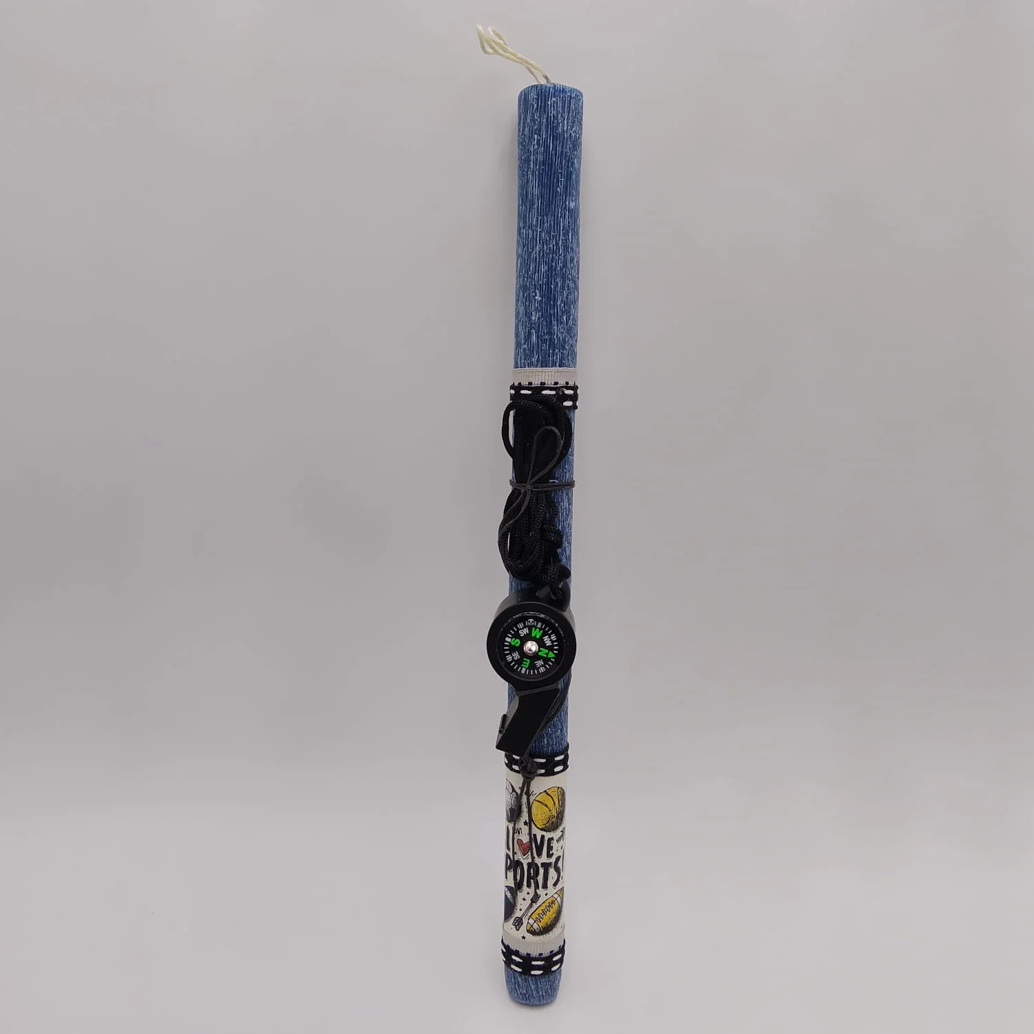 Στρογγυλή λαμπάδα 29 εκ από παραφίνη στολισμένη με σφυρίχτρα-πυξίδα.
