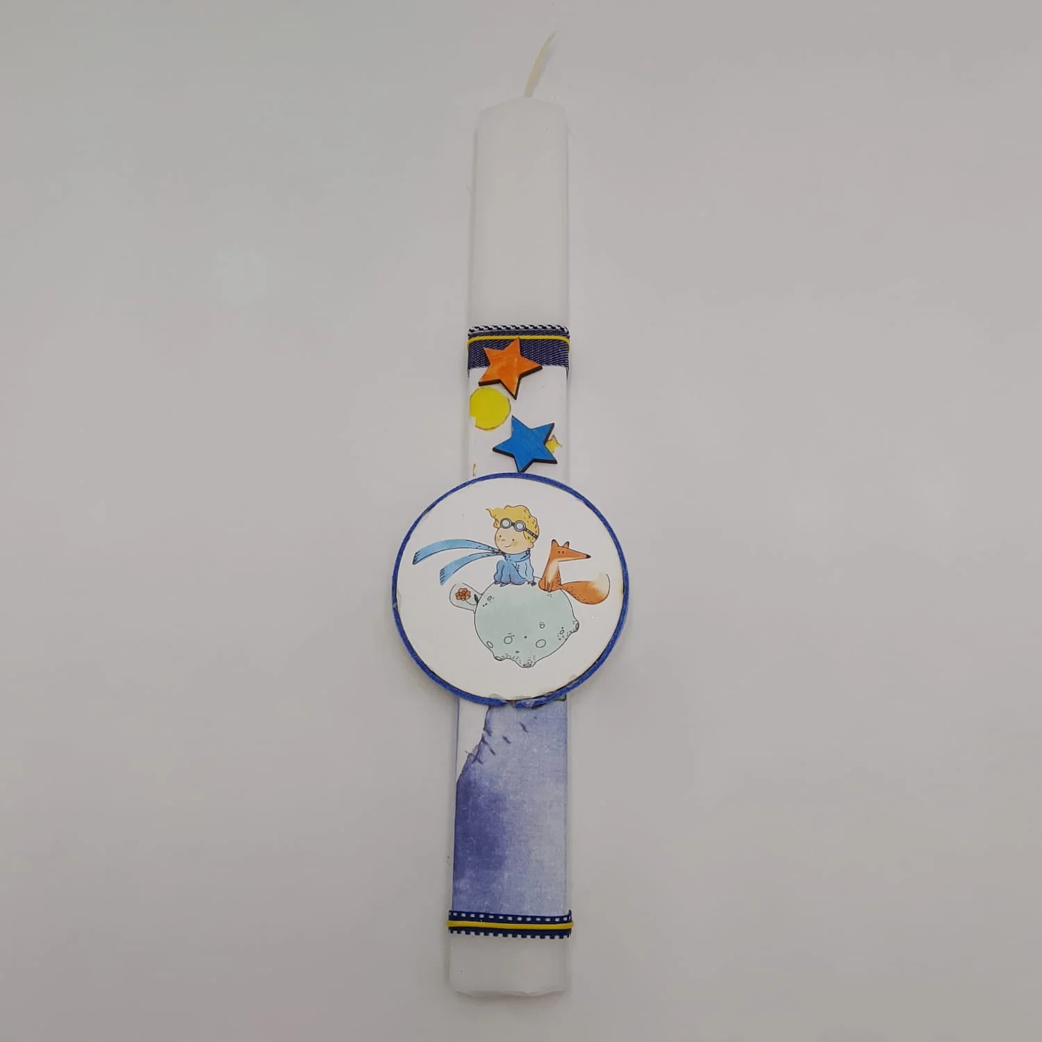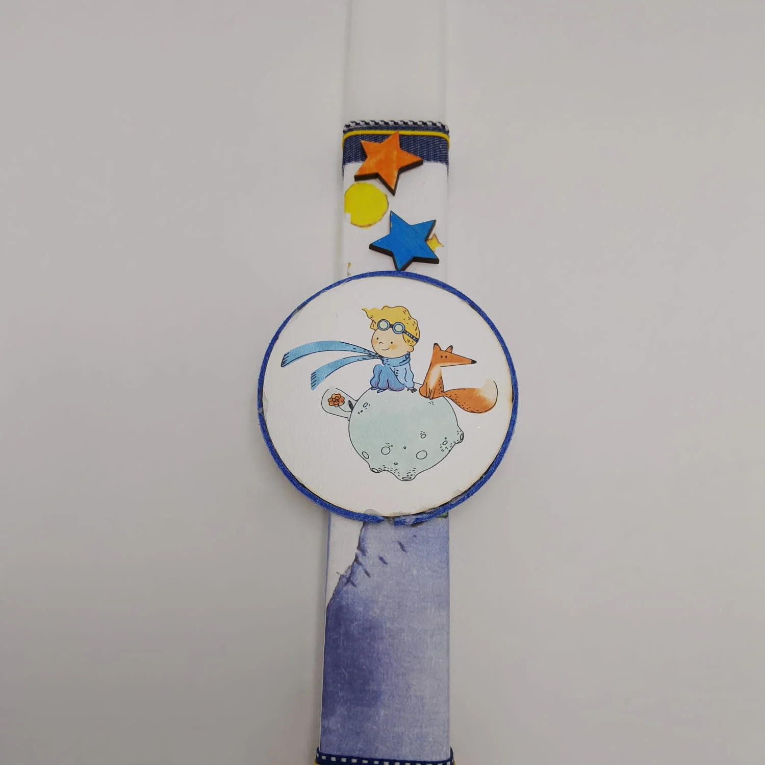 Λευκή πλακέ λαμπάδα 27 εκ. από παραφίνη στολισμένη με ξύλινο στρογγυλό διακοσμητικό με τον μικρό πρίγκιπα.