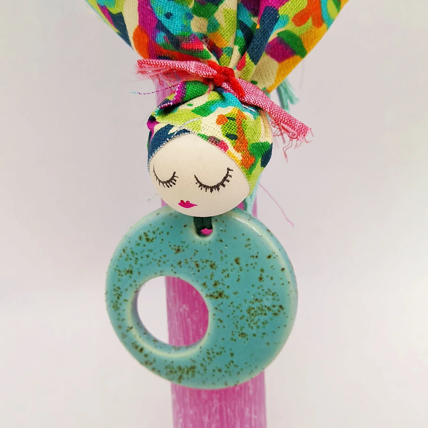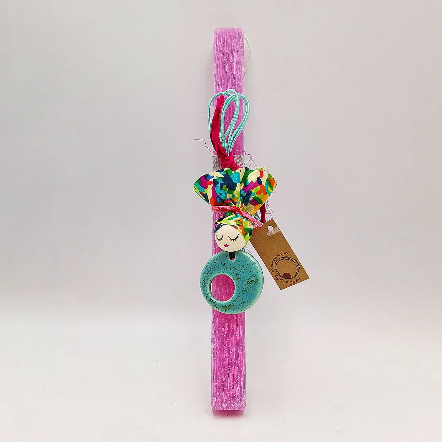 Λιλά τετράγωνη αρωματική λαμπάδα 25 εκ. από παραφίνη στολισμένη με κεραμικό κολιέ με μοτίβο κοπέλας.