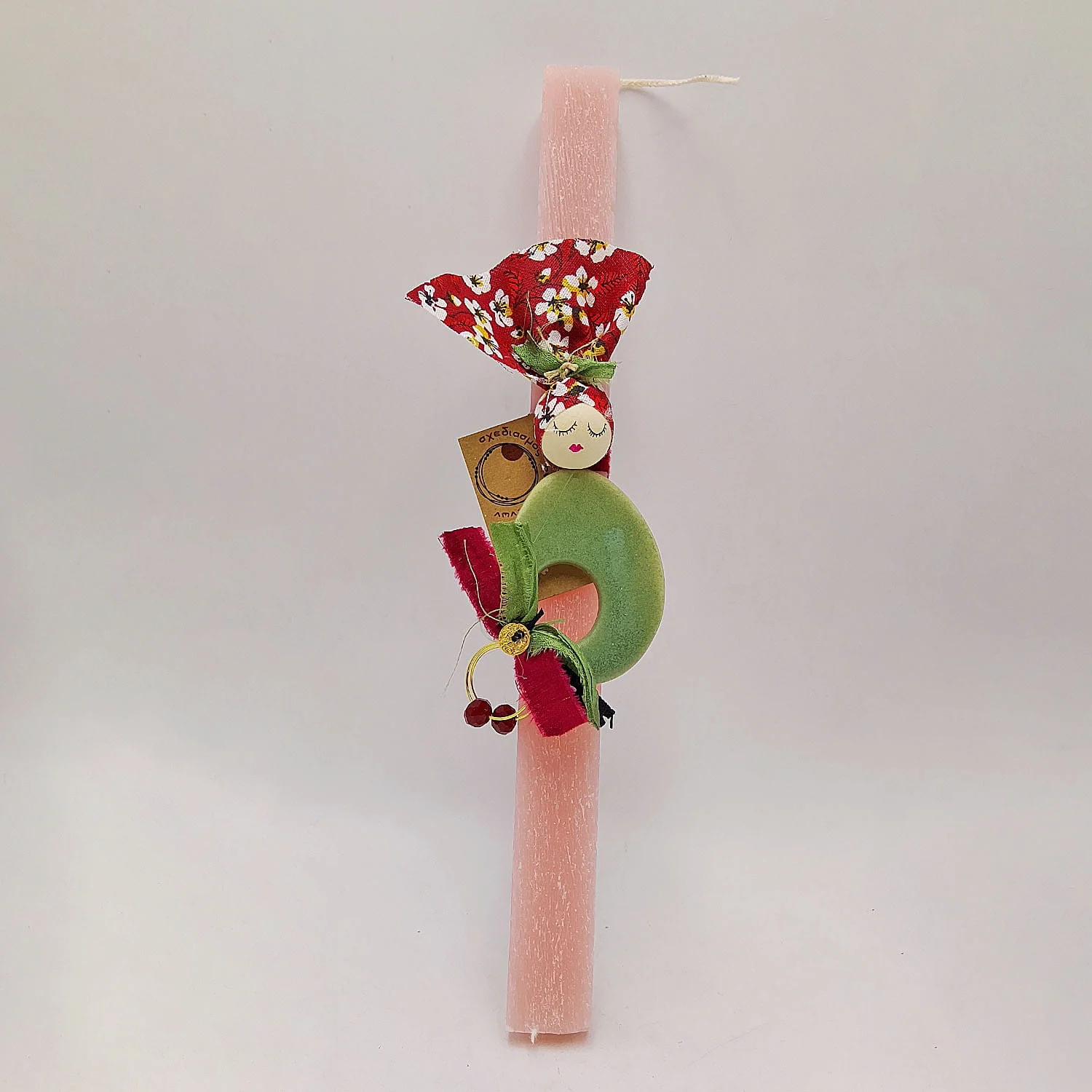 Ροζ τετράγωνη αρωματική λαμπάδα 25 εκ. από παραφίνη στολισμένη με χειροποίητο κεραμικό στοιχείο και σκουλαρίκια κρίκους.