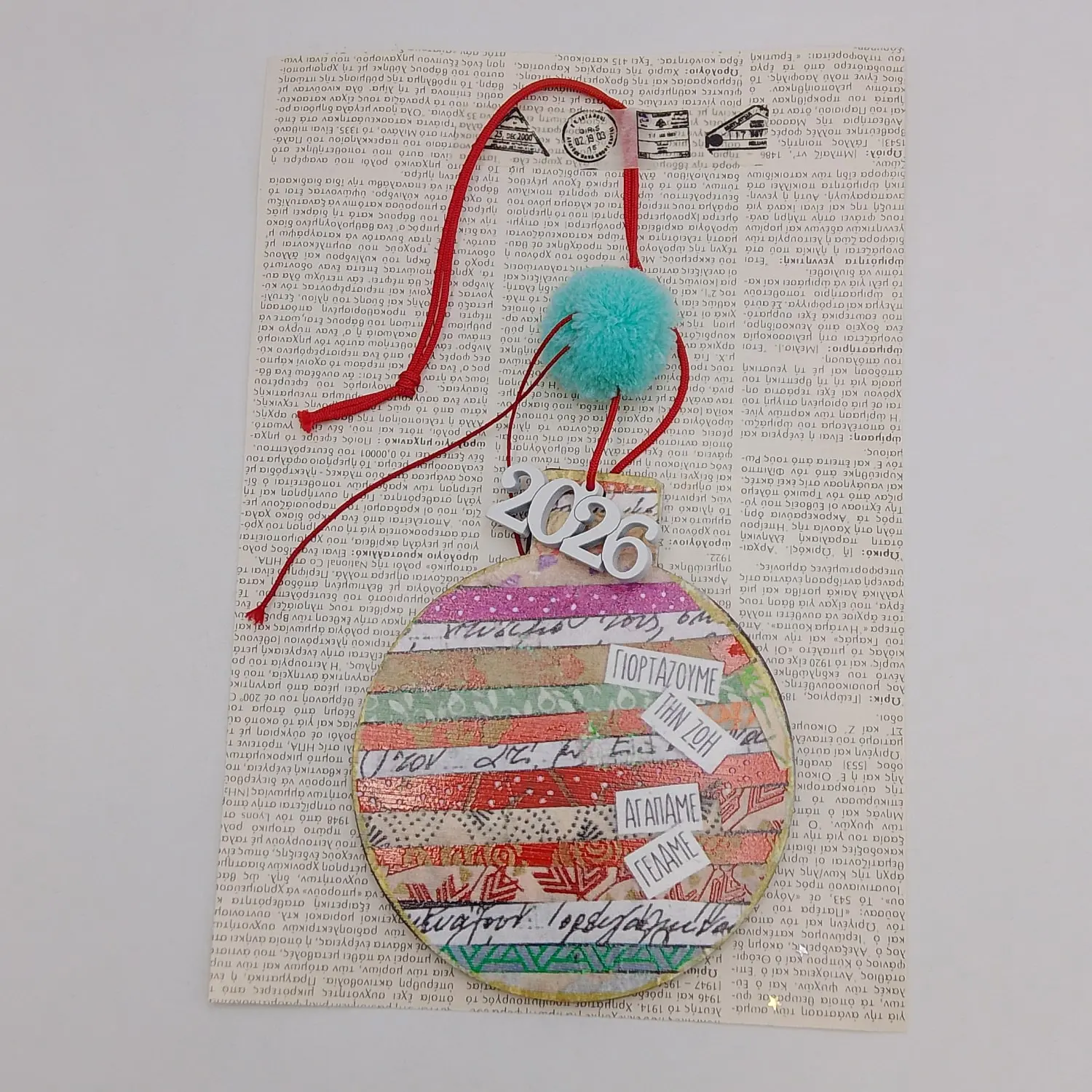 Ξύλινο στολίδι/γούρι σε σχήμα μπάλας διακοσμημένο με πον-πον και ξύλινο 2026.