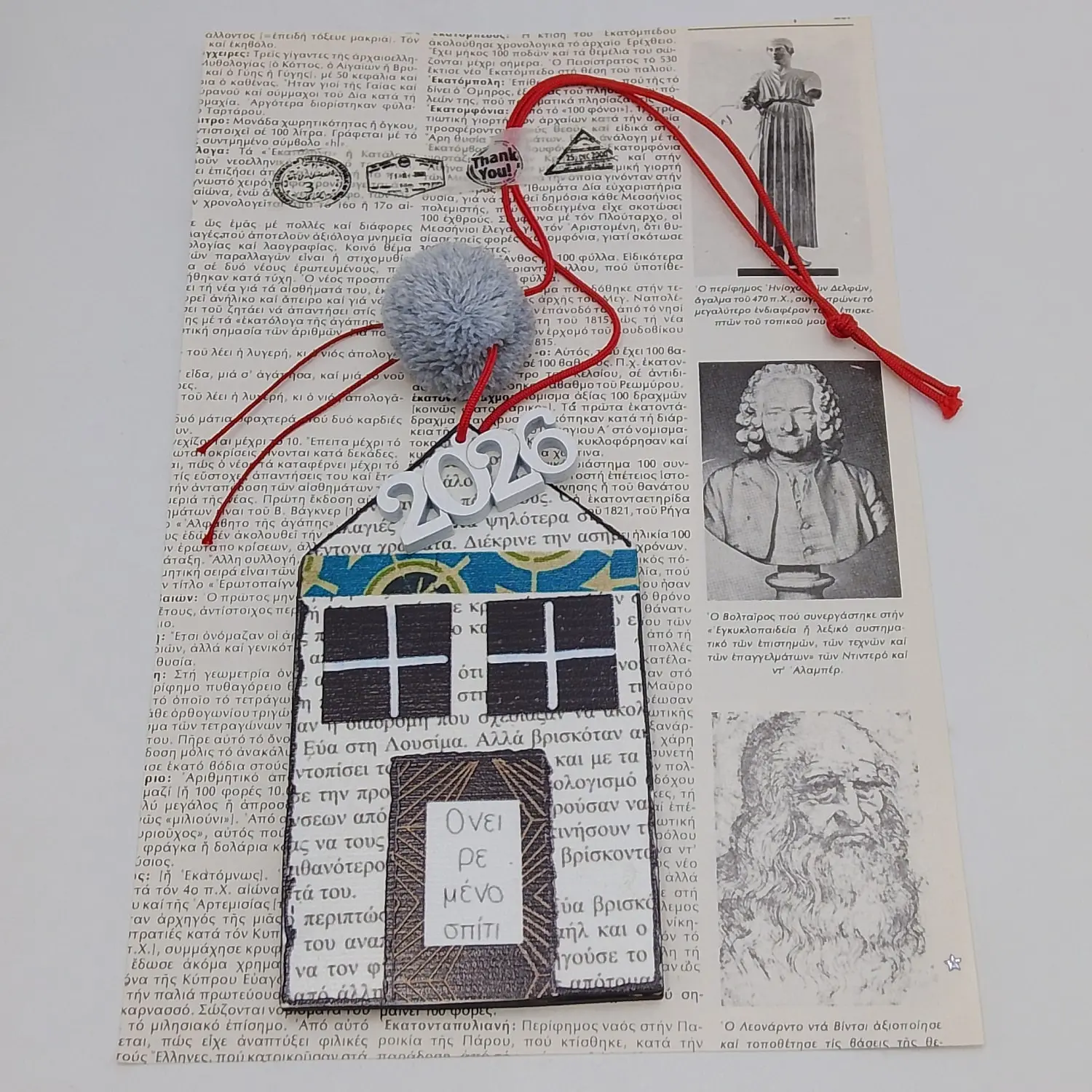 Ξύλινο στολίδι/γούρι σε σχήμα σπιτιού διακοσμημένο με πον-πον και ξύλινο 2026.
